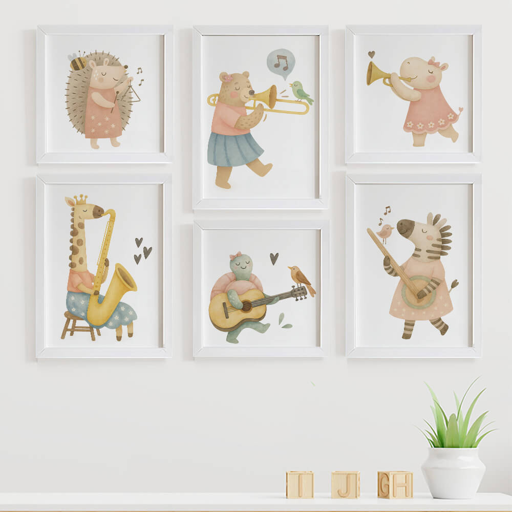 Neste kit são 6 quadros decorativos com animais músicos super fofos!