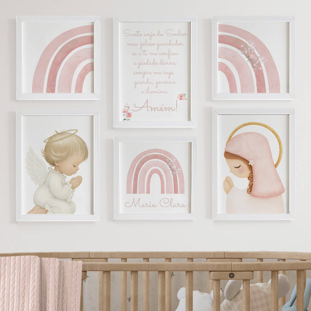 Composição com 6 quadros para quarto de bebê, todos super modernos com arco-íris, nome personalizado, anjinho, um quadro com a oração Santo Anjo e um quadro com Nossa Senhora.