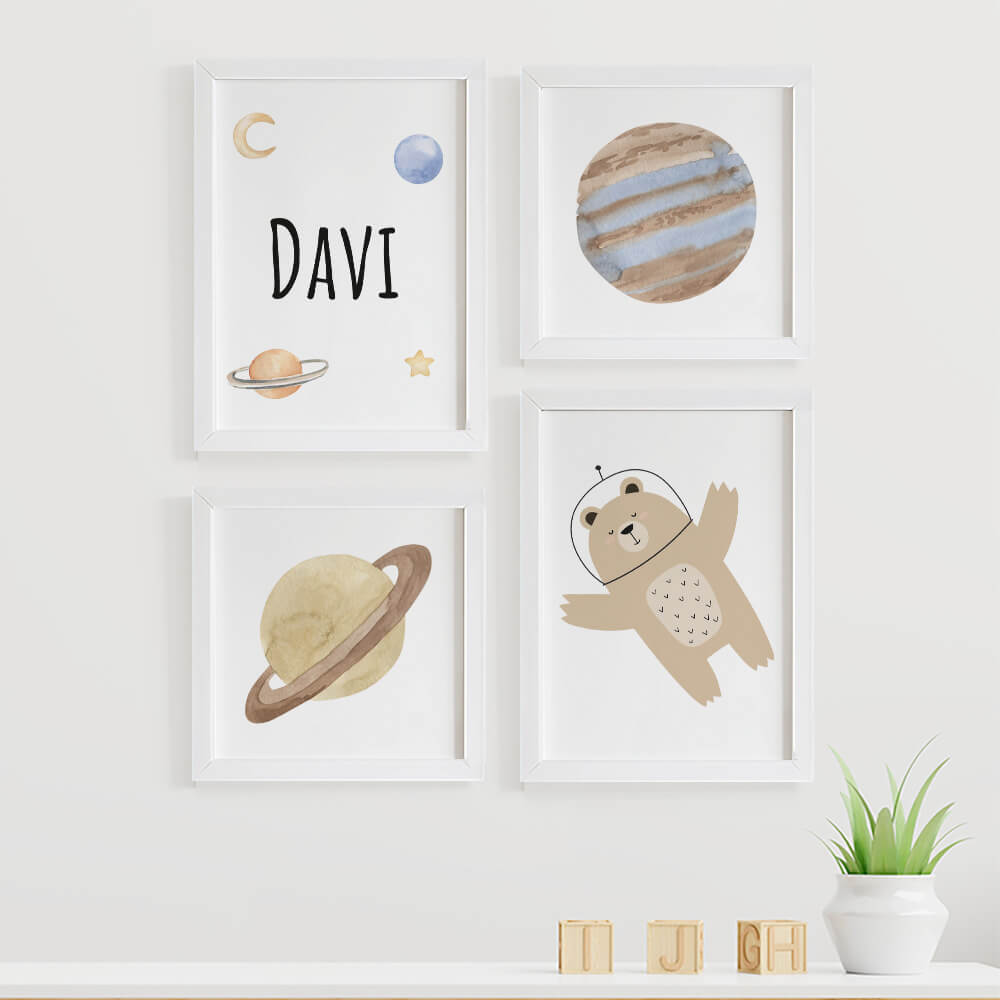 Quadros para quarto de bebê Astronauta Planetas e Urso com Nome Personalizado