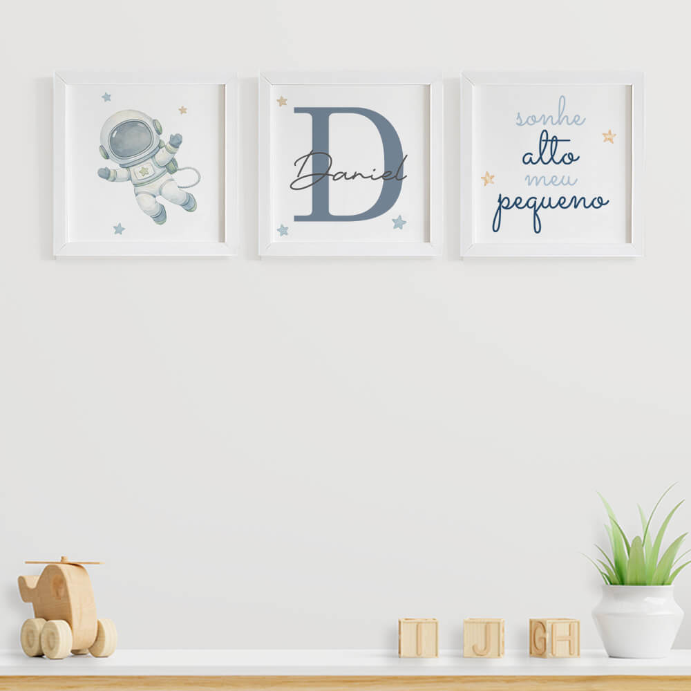 Quadros para quarto de bebê Astronauta Sonhe Alto com Inicial e Nome
