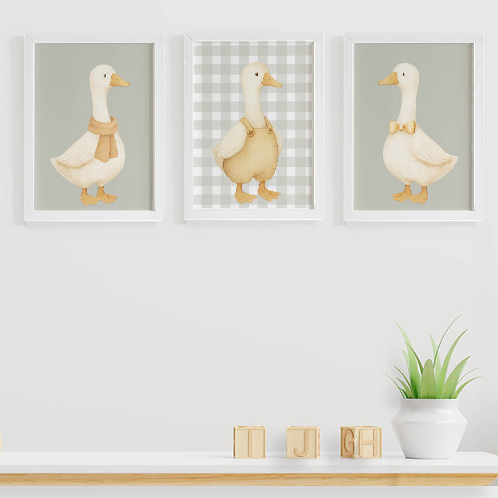 Composição com três quadros para quarto de bebê cheios de charme com gansos.