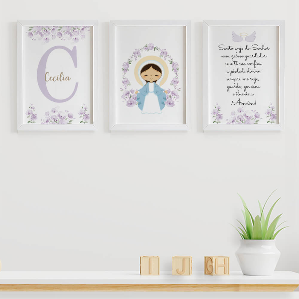 Quadro com a oração Santo Anjo + Quadro com Nossa Senhora das Graças + Quadro com inicial e nome