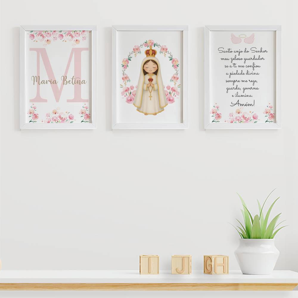 Quadro com a oração Santo Anjo + Quadro com Nossa Senhora de Fátima + Quadro com inicial e nome