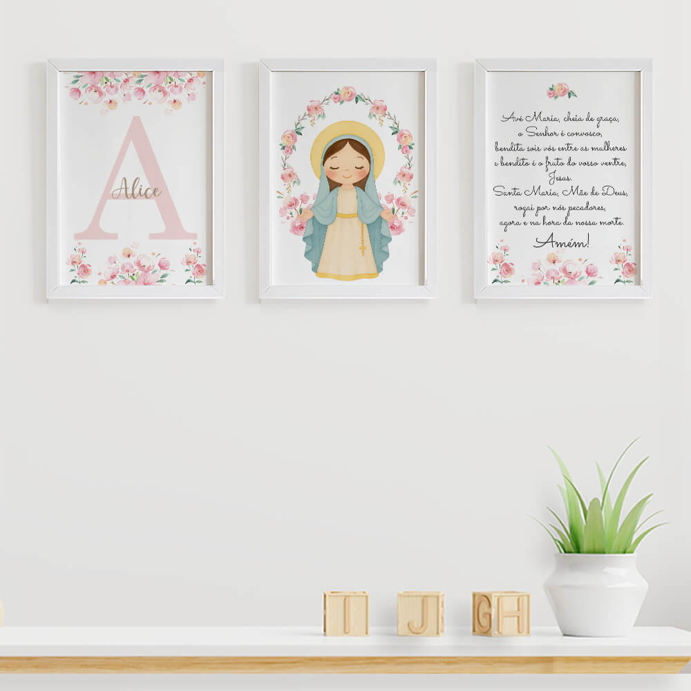 Quadro com a oração Ave Maria + Quadro com Nossa Senhora das Graças + Quadro com inicial e nome