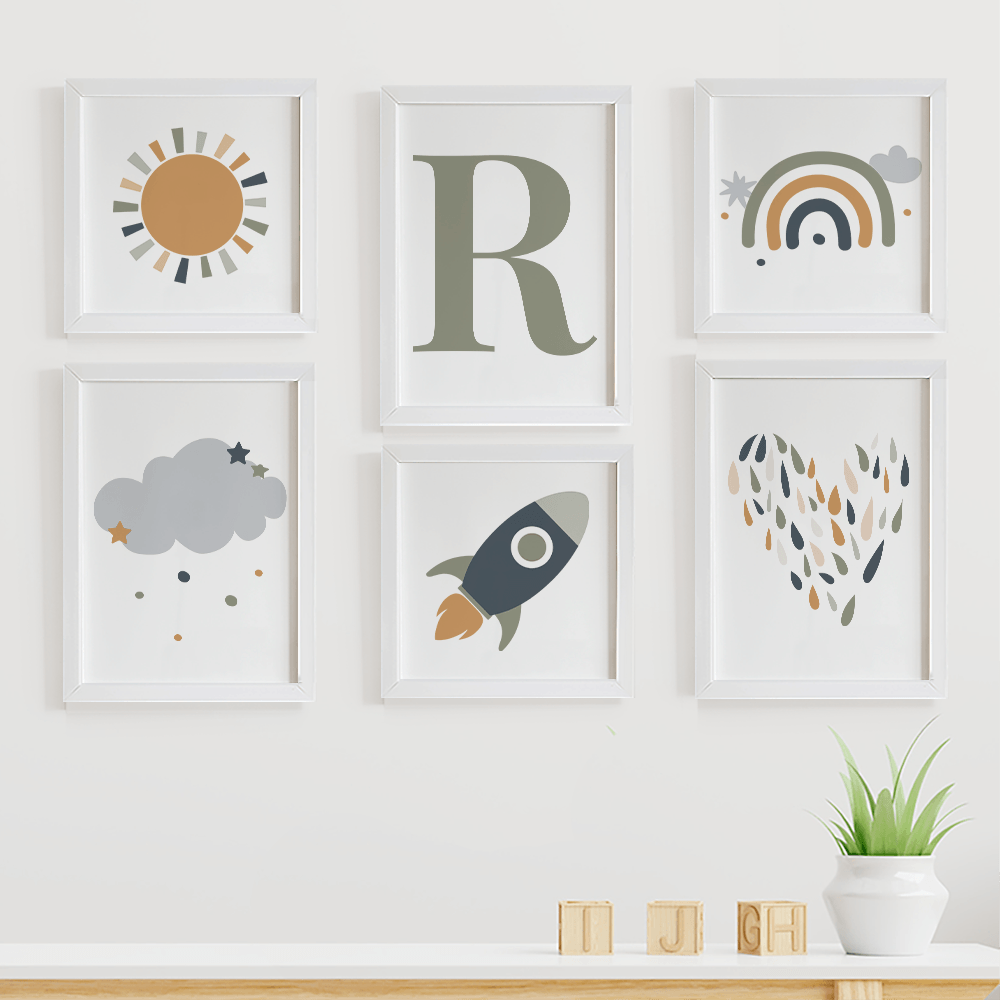 Quadros para quarto de bebê Nuvem Arco Íris Sol Foguete e Inicial do Nome