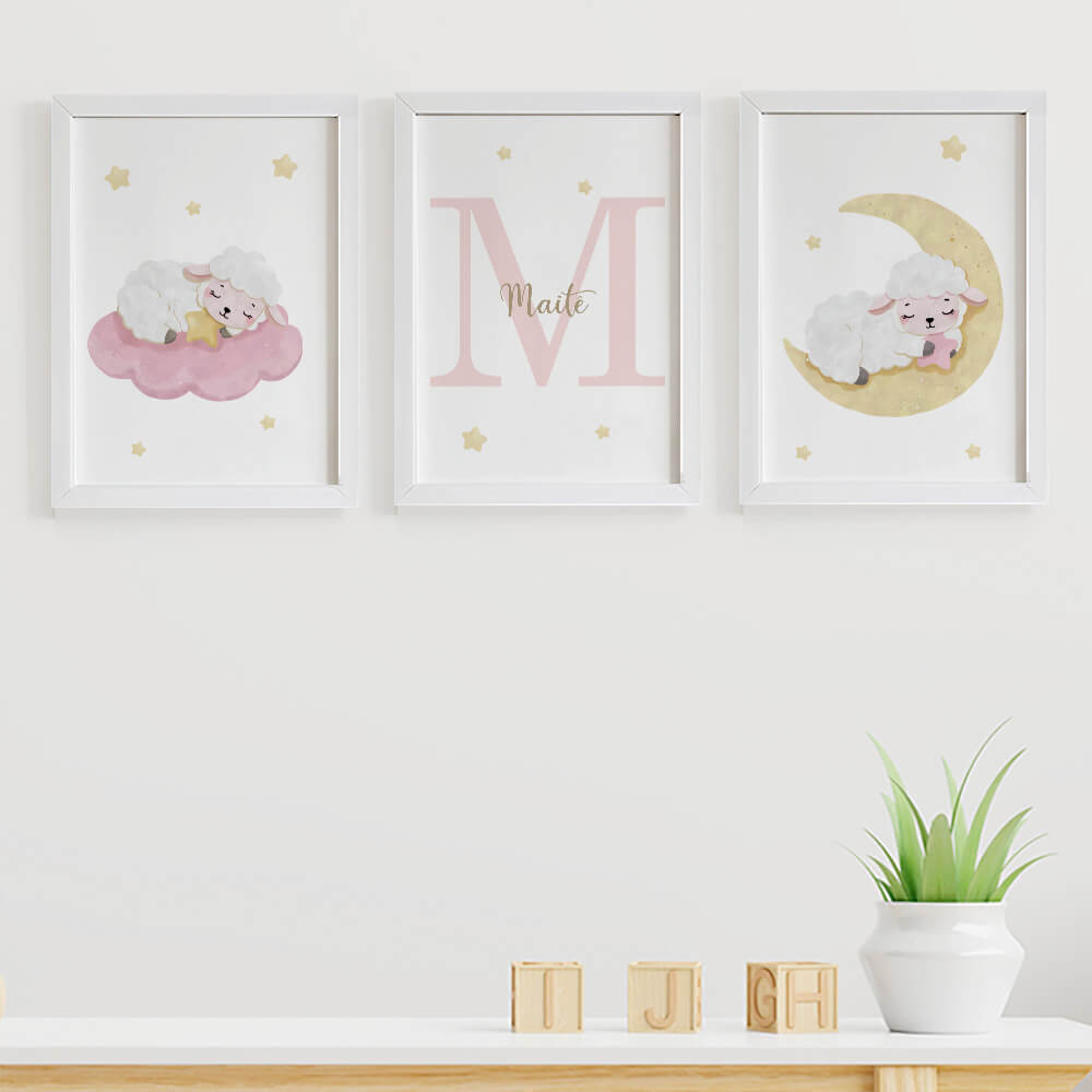 Quadros para quarto de bebê Ovelhinhas Nuvem Lua com Inicial e Nome