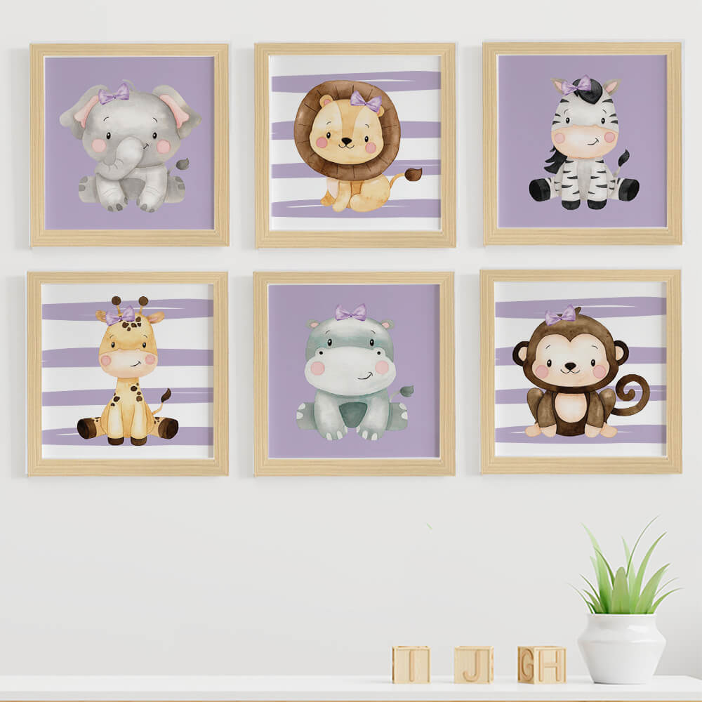 São seis quadros decorativos com animais: um quadro de elefante, um quadro de leão, um quadro de zebra, um quadro de girafa, um quadro de hipopótamo e um quadro de macaco.