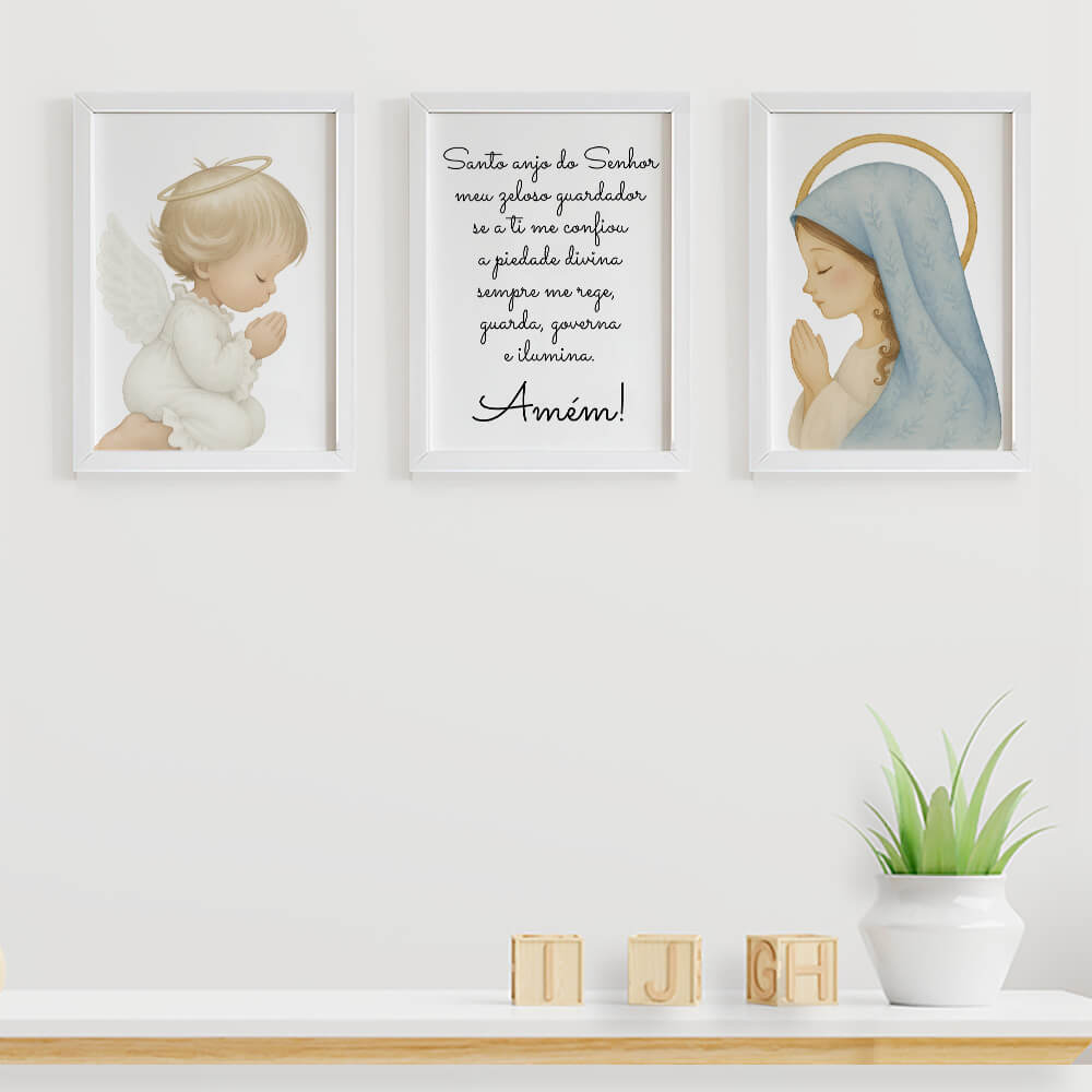 Quadros para quarto de bebê Santo Anjo com Anjinho Rezando Nossa Senhora