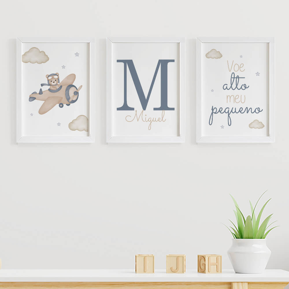 Quadros para quarto de bebê Ursinho Aviador + Inicial e Nome + Voe alto meu pequeno